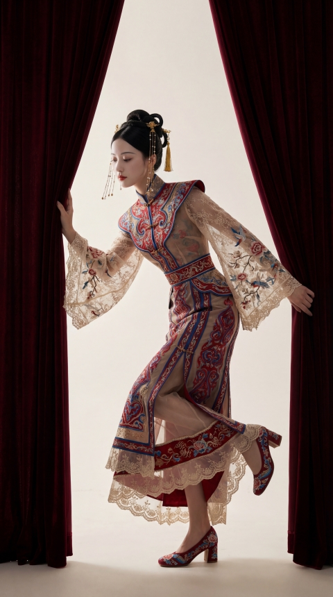 一张引人注目、时尚前卫的肖像照,照片中一位年轻女子回头看向镜头,站在一扇带有装饰性边框的深色木门旁