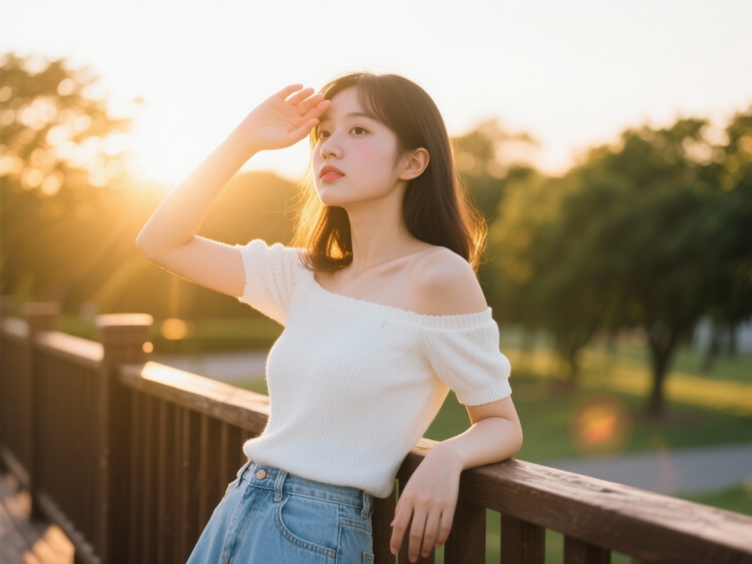 Pose:倚靠在木制栏杆上,背对太阳 用一只手遮住眼睛,避免阳光直射,在脸上制造光影效果