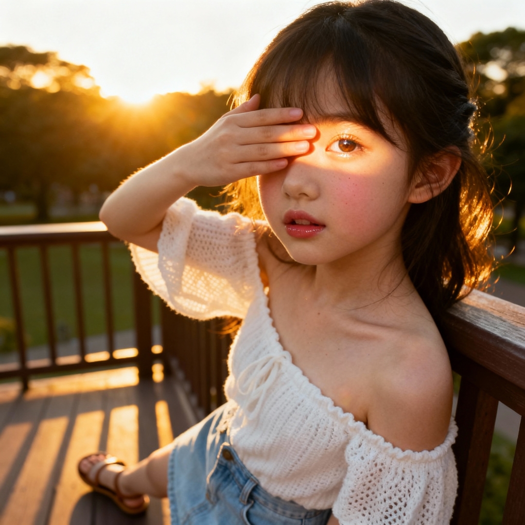 Pose:倚靠在木制栏杆上,背对太阳 用一只手遮住眼睛,避免阳光直射,在脸上制造光影效果