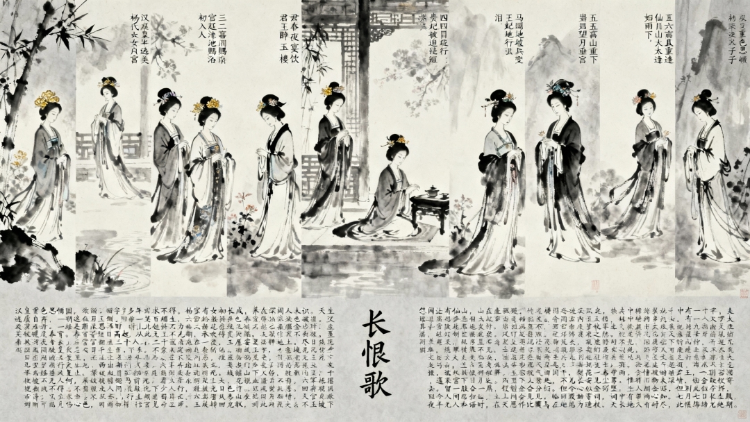 梨园弟子白发新,椒房阿监青娥老。夕殿萤飞思悄然,孤灯挑尽未成眠。迟迟钟鼓初长夜,耿耿星河欲曙天。鸳鸯瓦冷霜华重,翡翠衾寒谁与共?悠悠生死别经年,魂魄不曾来入梦。