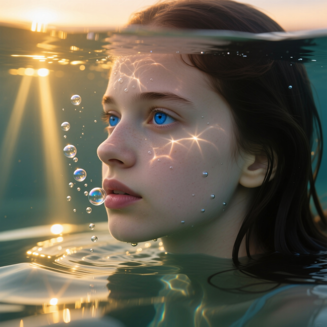 description:一幅超写实、细节丰富的特写肖像,描绘了一位年轻女子浸在水中的左半边脸。她的一只眼睛清晰可见。光线在她皮肤上形成折射和流动的纹理。悬浮的细小水滴和气泡增添了画面的深度。