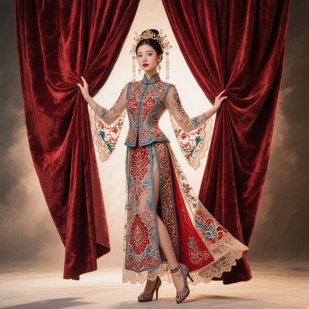 Wardrobe:身穿华丽的皮影戏风格的服饰,立领、收腰、开衩长裙,透明丝绸底布配红色和蓝色的繁复刺绣花纹和金色细节,袖子是宽大的半透明蕾丝喇叭袖,上面有精致的花鸟刺绣,裙摆多层蕾丝和刺绣边。她脚穿同款图案的粗跟高跟鞋。
