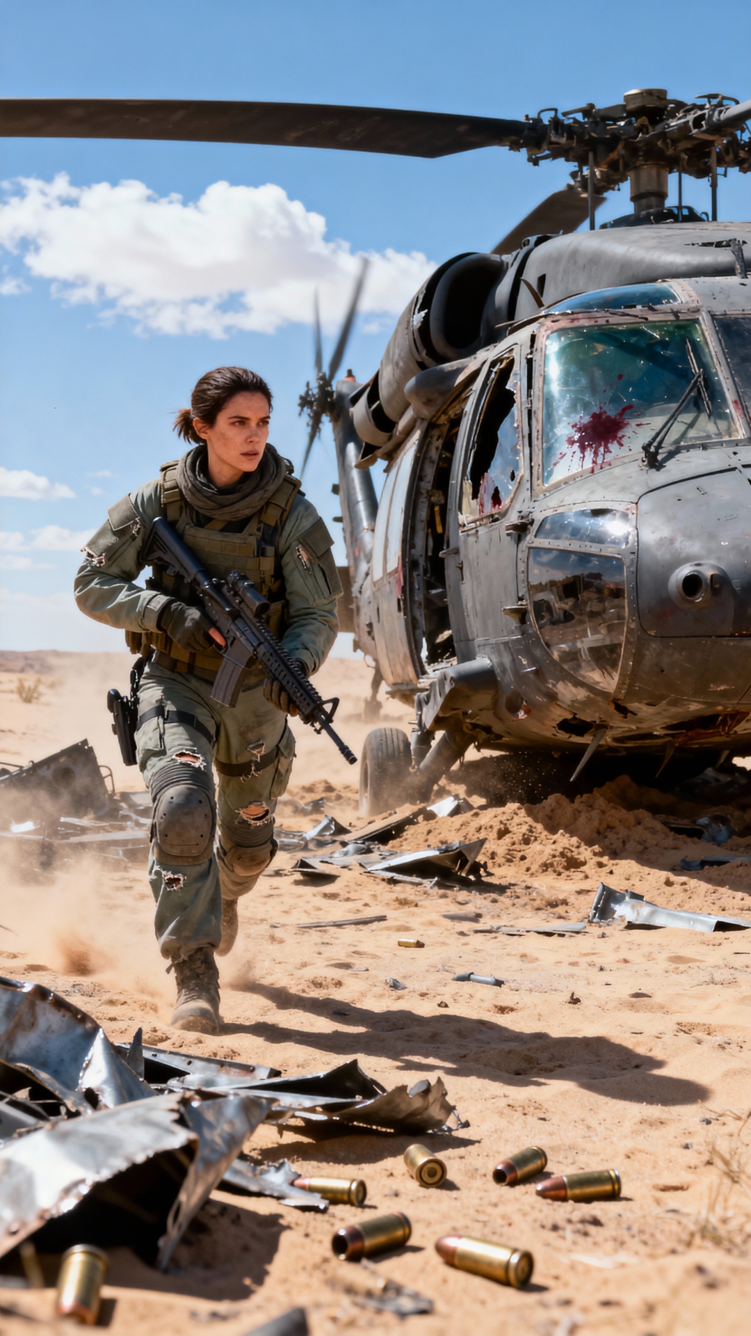 Background:刚刚的坠毁阿帕奇直升机,机身破损严重,半个机头已经坠毁,一小半在沙土里面,飞机窗户上有一些残留的血迹